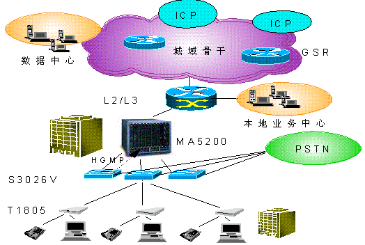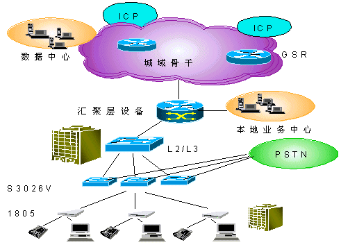 在用戶接入層Quidway S3026V提供24路VDSL接入,在普通雙絞線上提供12Mbps的雙向?qū)ΨQ數(shù)據(jù)業(yè)務(wù),傳輸距離最大可達(dá)1500m,在完成以太網(wǎng)接入的同時(shí),不影響POTS業(yè)務(wù)。S3026V上行FE接口直接接入L3交換機(jī)。同時(shí),通過(guò)雙絞用戶線完成了與PSTN交換機(jī)的相連,將寬帶、窄帶業(yè)務(wù)在S3026V上匯合,并通過(guò)已有雙絞電話線連接至遠(yuǎn)端用戶設(shè)備(1805)。1805可以通過(guò)五類線與計(jì)算機(jī)網(wǎng)卡相連。