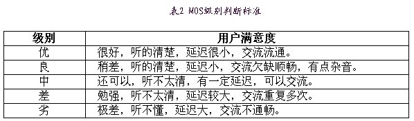 MOS(MeanOpinionScore)是一種常用的主觀評價(jià)標(biāo)準(zhǔn)。IP電話業(yè)務(wù)的MOS定義為四級:4.0-5.0(優(yōu))、3.5-4.0(良)、3.0-3.5(中)、1.5-3.0(差)、0-1.5(劣)。用戶滿意度和MOS等級的對應(yīng)關(guān)系見表2。