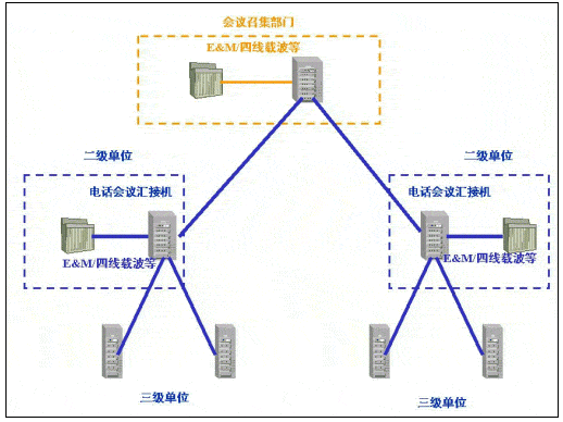當(dāng)前國(guó)內(nèi)許多行業(yè)由于行業(yè)的業(yè)務(wù)特點(diǎn),在原有的電話網(wǎng)應(yīng)用中,電話會(huì)議作為常用的交流手段發(fā)揮著重要作用。這些行業(yè)的電話會(huì)議業(yè)務(wù),主要是通過(guò)電話會(huì)議匯接機(jī)的方式實(shí)現(xiàn):會(huì)議召集單位通過(guò)電話會(huì)議匯接機(jī)(以下簡(jiǎn)稱(chēng)匯接機(jī))通過(guò)專(zhuān)線、撥號(hào)等方式連通下級(jí)單位(以下簡(jiǎn)稱(chēng)二級(jí)單位)的匯接機(jī),二級(jí)單位的匯接機(jī)通過(guò)專(zhuān)線、撥號(hào)等方式連通所轄單位(以下簡(jiǎn)稱(chēng)三級(jí)單位)的會(huì)場(chǎng)電話。這樣通過(guò)多級(jí)匯接機(jī)級(jí)連的方式實(shí)現(xiàn),主持單位和二、三級(jí)單位間的電話網(wǎng)連通,利用匯接機(jī)實(shí)現(xiàn)廣播、三方通話、調(diào)度發(fā)言單位等會(huì)議功能。