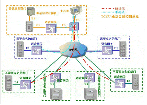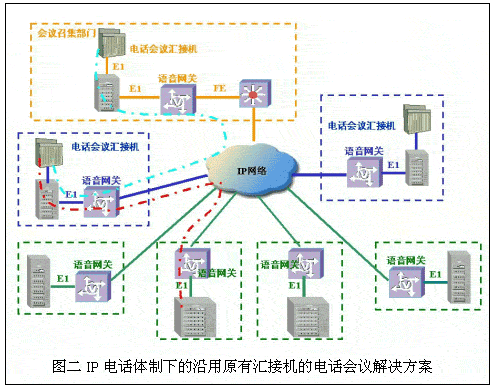 采用原有的會(huì)議電話架構(gòu),只是話音的長(zhǎng)途連接由模擬專(zhuān)線等改為IP傳輸。方案由于采用原有電話會(huì)議匯接機(jī),保護(hù)了用戶的原有投資。缺點(diǎn)是在召開(kāi)多級(jí)會(huì)議電話時(shí),由于語(yǔ)音信號(hào)首先在召集單位語(yǔ)音網(wǎng)關(guān)進(jìn)行壓縮,經(jīng)IP傳輸后,在二級(jí)單位語(yǔ)音網(wǎng)關(guān)解壓縮還原為模擬話音,再經(jīng)二級(jí)單位的語(yǔ)音網(wǎng)關(guān)二次壓縮,經(jīng)IP網(wǎng)傳輸后,在三級(jí)單位的語(yǔ)音網(wǎng)關(guān)上二次解壓縮,導(dǎo)致語(yǔ)音信號(hào)多次壓縮/還原,對(duì)語(yǔ)音質(zhì)量損傷較大。