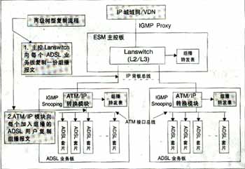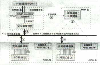 可實現(xiàn)高效的兩級組播;诳臻g總線上的組播信元技術實現(xiàn),與組播用戶數(shù)無關,同一節(jié)目即使所有用戶加入該頻道,僅需復制一份,不用逐個用戶復制到每個用戶端口,極大節(jié)省了背板帶寬,減輕IP上行負擔?蓪崿F(xiàn)高性能硬件組播轉(zhuǎn)發(fā)。IP上行板采用超大規(guī)模FPGA硬件邏輯處理組播報文,ADSL板采用空間組播處理硬件芯片自動完成向每個ADSL端口(用戶)的組播復制,每ADSL端口組播帶寬6M。