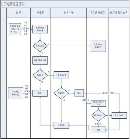 后臺(tái)處理座席員根據(jù)業(yè)務(wù)知識(shí)、資料庫(kù)和管理職責(zé)為市民服務(wù),如果不能處理,將請(qǐng)求提交相關(guān)政府部門并限時(shí)處理;