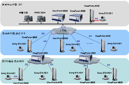 省到17個地市的二級網(wǎng)采用: ViewPoint 8650 高清MCU 2臺,用于媒體交換和信令交互。Viewpoint