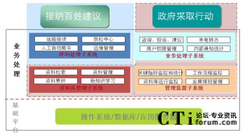 在架構設計上,從電話接入、辦件流程、資料庫管理、信息維護到報表統(tǒng)計都實現(xiàn)了一體化設計理念。以業(yè)務流程設計為例,針對市民來電中的咨詢類的問題,12345政府熱線將直接由前臺接聽人員利用各部門預先錄入資料庫中的規(guī)范答案來回答市民的提問;對市民反映、建議、投訴類的來電,則由前臺記錄后轉給市信訪辦的后臺工作人員處理。一整套開放性的工作流和穩(wěn)定的技術后臺支持確保了市民可以在規(guī)定的時間內得到政府的權威處理與回復。