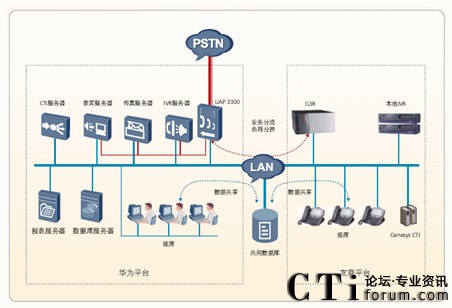 客戶(hù)電話通過(guò)PSTN統(tǒng)一由華為UAP3300排隊(duì)機(jī)接入,由華為平臺(tái)的IVR服務(wù)器進(jìn)行業(yè)務(wù)導(dǎo)航分流,根據(jù)用戶(hù)的選擇和IVR流程的配置進(jìn)行路由,可以選擇不同平臺(tái)來(lái)處理此業(yè)務(wù)。來(lái)話根據(jù)IVR流程路由后,兩個(gè)平臺(tái)采用負(fù)荷分擔(dān)方式進(jìn)行工作。在將來(lái)話導(dǎo)入兩個(gè)平臺(tái)后,采用不同設(shè)備的IVR進(jìn)行業(yè)務(wù)分配,不同平臺(tái)的座席處理不同的業(yè)務(wù)。在處理過(guò)程中,不同平臺(tái)的座席之間可以互轉(zhuǎn),達(dá)到全網(wǎng)資源共享的功能。