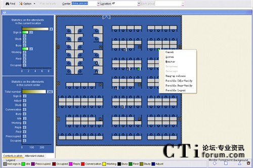 系統(tǒng)提供一整套管理工具,輔以圖形化的人性設(shè)計(jì),將復(fù)雜的設(shè)備維護(hù)和系統(tǒng)優(yōu)化簡(jiǎn)化為簡(jiǎn)單的圖形管理,降低了維護(hù)難度和對(duì)維護(hù)人員的要求,提高了維護(hù)效率,使聯(lián)絡(luò)中心更為穩(wěn)定可靠地運(yùn)行。座席地圖按真實(shí)座席位置展現(xiàn)座席狀態(tài),使業(yè)務(wù)代表服務(wù)質(zhì)量的監(jiān)控和檢查更為形象高效,有利于提升業(yè)務(wù)代表服務(wù)質(zhì)量。