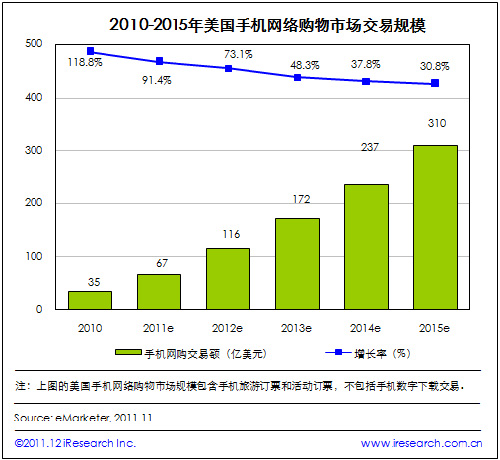 iResearch艾瑞咨詢整理eMarketer的最新數(shù)據(jù)研究發(fā)現(xiàn),2011年美國手機網(wǎng)絡(luò)購物市場交易規(guī)模相比2010年增長91.4%,將達(dá)到67億美元。未來幾年,美國手機網(wǎng)購交易規(guī)模將繼續(xù)較快增長,預(yù)計2015年美國的手機網(wǎng)購交易規(guī)模將達(dá)到310億美元。