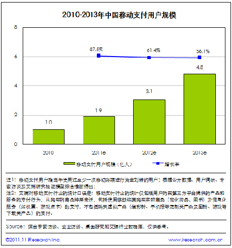 根據(jù)艾瑞咨詢統(tǒng)計數(shù)據(jù),2011年中國移動支付用戶規(guī)模將達(dá)到1.9億。艾瑞預(yù)計,2013年中國移動支付用戶規(guī)模將達(dá)到4.8億。移動網(wǎng)上支付用戶規(guī)模的增長帶動了整個行業(yè)用戶規(guī)模的爆發(fā),另外手機短信支付也在用戶群體中得到了進(jìn)一步的普及。