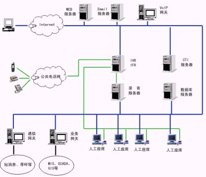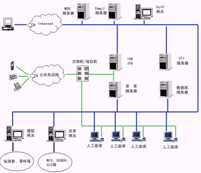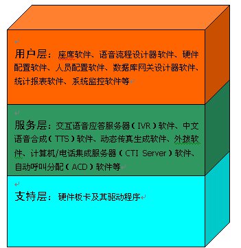 2、服務(wù)層:交互語音應(yīng)答服務(wù)器(IVR)軟件、中文語音合成(TTS)軟件、動態(tài)傳真生成軟件、外撥軟件、計算機/電話集成服務(wù)器(CTI Server)軟件、自動呼叫分配(ACD)軟件等等。