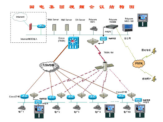 128,集團下屬60個電廠均采用視頻終端ViewStation 128。整個網(wǎng)絡采用Polycom MCU的混速功能,在本部中心采用768Kbps進行視頻傳輸,和下屬60個電廠及分公司采用128Kbps進行傳輸。由于網(wǎng)絡傳輸線路分為衛(wèi)星線路和地面有線網(wǎng)絡,衛(wèi)星線路帶寬為768Kbps-1Mbps,用于業(yè)務下行線路,地面有線網(wǎng)絡128Kbps用于視頻回傳。根據(jù)網(wǎng)絡傳輸線路的實際情況,在本部中心利用1臺視頻終端將其模擬信號(AV信號)送到衛(wèi)星端接設備(包含MODEM,編解碼器等),將模擬信號轉(zhuǎn)換成數(shù)字信號(MPEG4),利用768K-1Mbps衛(wèi)星線路廣播到每個接收點,通過每個接收點的編解碼器將數(shù)字信號轉(zhuǎn)換成模擬信號連接到顯示終端(如TV、顯示器)上進行收看,通過這種方式可以實現(xiàn)利用衛(wèi)星線路的高帶寬,并利用其廣播特性,節(jié)省投資。