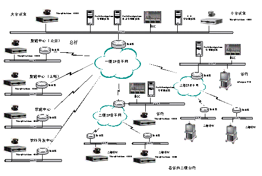 中國工商銀行此前已具備覆蓋一級分支機(jī)構(gòu)的衛(wèi)星視頻會議系統(tǒng)和部分基于TCP/IP網(wǎng)絡(luò)的二級分支機(jī)構(gòu)的H.323視頻會議系統(tǒng),并在此網(wǎng)絡(luò)中使用了包括寶利通在內(nèi)的多家廠商的產(chǎn)品。但是,隨著機(jī)構(gòu)業(yè)務(wù)的不斷擴(kuò)大,原有系統(tǒng)已無法滿足目前的需要。而網(wǎng)絡(luò)技術(shù)的快速發(fā)展,使地面通訊線路的使用成本大幅降低,地面網(wǎng)絡(luò)的穩(wěn)定性、易維護(hù)性、帶寬可擴(kuò)充性也使視頻會議系統(tǒng)的傳輸由傳統(tǒng)的較昂貴的衛(wèi)星專用信道轉(zhuǎn)向地面TCP/IP網(wǎng)絡(luò)成為大勢所趨。因此,工行決定在全行范圍內(nèi)替換原有H.320視頻會議系統(tǒng),神州數(shù)碼應(yīng)用網(wǎng)絡(luò)事業(yè)部基于中國工商銀行視頻會議系統(tǒng)特點采用TCP/IP網(wǎng)絡(luò)的H.323視頻會議系統(tǒng)。