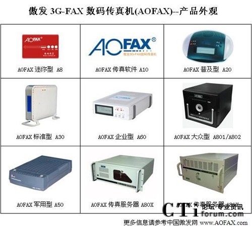 AOFAX系列電腦傳真產(chǎn)品擁有最齊全的型號,包括免費使用的AOFAX傳真軟件A10、SOHO/商旅人士便攜使用的AOFAX迷你型數(shù)碼傳真機A8、單電腦使用的AOFAX普及型數(shù)碼傳真機A20、4用戶環(huán)境的AOFAX標(biāo)準(zhǔn)型電子傳真機A30、軍警使用的AOFAX軍用型傳真系統(tǒng)A50、公安專用傳真服務(wù)器A51、營運版網(wǎng)絡(luò)傳真服務(wù)期A52、不限用戶數(shù)目的AOFAX企業(yè)型網(wǎng)絡(luò)傳真機A60、1至2線的AOFAX大眾型傳真服務(wù)器A801和A802,2至256傳真線路多種規(guī)格的AOFAX專業(yè)型傳真服務(wù)器A80X、跨區(qū)域大型公司使用的集團傳真系統(tǒng)和行業(yè)解決方案等,價格從幾百到幾十萬元,可適應(yīng)各類型客戶的需求,以下為AOFAX全系列產(chǎn)品外觀圖。