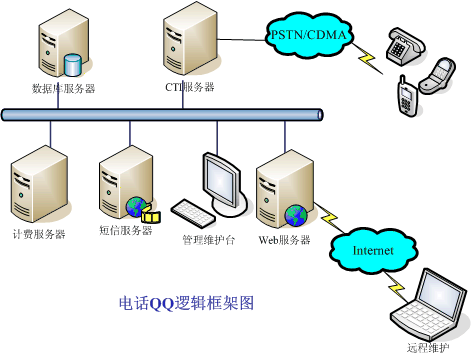 電話QQ系統(tǒng)主要由CTI服務(wù)器、數(shù)據(jù)庫服務(wù)器、計費服務(wù)器、短信服務(wù)器、管理維護(hù)臺和Web服務(wù)器組成。