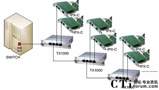 將PBX或網(wǎng)絡(luò)Switch的鏡像端口連接到TX1000的Network口,另一個Network口和Monitor 端口就可將一個端口的數(shù)據(jù)備份成三個端口的數(shù)據(jù),實現(xiàn)了一分三的功能。若再接一個TX1000,就可以繼續(xù)分用,以此類推,根據(jù)各個IP應(yīng)用中實際所需的備份/分用,TX1000都可予以實現(xiàn)。