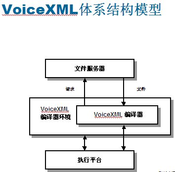 VoiceXML設(shè)計(jì)的工作原理:語(yǔ)音應(yīng)用程序作為系列頁(yè)存儲(chǔ)在類似于網(wǎng)絡(luò)服務(wù)器的文件服務(wù)器上。從實(shí)現(xiàn)平臺(tái)接收到輸入呼叫時(shí),VoiceXML編譯程序會(huì)向文件服務(wù)器發(fā)出一個(gè)特定URL請(qǐng)求,就像用戶瀏覽網(wǎng)絡(luò)時(shí)輸入網(wǎng)站地址一樣。文件服務(wù)器可以與編譯程序直接相連,也可以設(shè)置在外部,通過本地網(wǎng)或互聯(lián)網(wǎng)的IP協(xié)議訪問。他們可以保持應(yīng)用程序的服務(wù)邏輯,可以提供數(shù)據(jù)庫(kù)查找與其他系統(tǒng)操作功能。