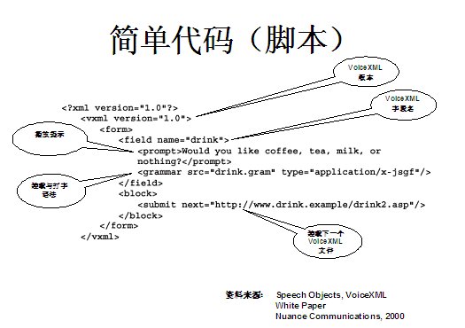 世界上最古老的用戶界面--人類語(yǔ)言終于在二十一世紀(jì)借助于VoiceXML,一種語(yǔ)音可擴(kuò)展標(biāo)記語(yǔ)言發(fā)展成熟起來(lái)。作為世界上第一個(gè)真正的語(yǔ)音通信標(biāo)準(zhǔn),它定義了應(yīng)用開發(fā)商向用戶提供新型信息訪問服務(wù)的方式。通過這種服務(wù),用戶在任何地方,都可以通過電話或任何移動(dòng)設(shè)備,虛擬訪問任何信息。VoiceXML正在被廣泛應(yīng)用于旅游、金融與信息服務(wù)等行業(yè)的各種業(yè)務(wù)領(lǐng)域中,甚至是政府部門與市政機(jī)構(gòu),全球的無(wú)線運(yùn)營(yíng)商等。