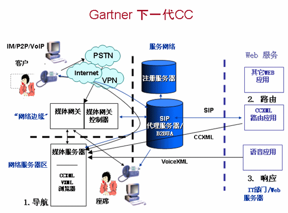 根據(jù)上圖,Gartner認為下一代呼叫中心基于SIP架構,SIP開放特性將賦予呼叫中心系統(tǒng)更多的接入方式和應用,其中CCXML和VXML的應用尤為突出。
