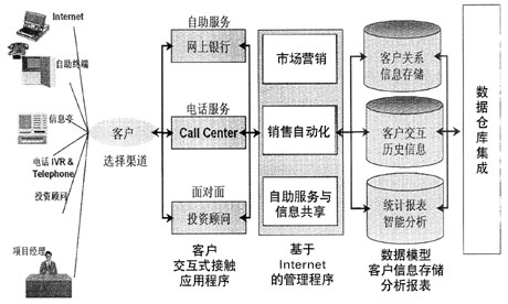 針對商業(yè)銀行面臨的挑戰(zhàn)和真實的需要,Oracle開發(fā)了面向銀行業(yè)的CRM解決方案。該解決方案提供全方位、統(tǒng)一的多渠道協(xié)同的客戶交互服務(wù)入口,包括網(wǎng)上自助服務(wù)、網(wǎng)上他助服務(wù)(通過Call Center在線指導客戶理財或提供投資建議)、電話自助服務(wù)、電話專家服務(wù)、電話智能市場推銷和銷售等。現(xiàn)場服務(wù)則提供客戶經(jīng)理與客戶面對面交流的能力,包括知識共享(金融市場信息、銀行產(chǎn)品信息和各業(yè)務(wù)部門發(fā)布的信息等)、銀行信息的及時獲取、產(chǎn)品和服務(wù)介紹、適時的投資建議、客戶交易行為追蹤、通過智能化工具提供專家服務(wù)、銷售機會管理等,允許重點客戶通過Web、電話或與客戶經(jīng)理/投資顧問面談等方式,提供更靈活的服務(wù)選擇和更及時的服務(wù),以保留大客戶群,增長股東利益。