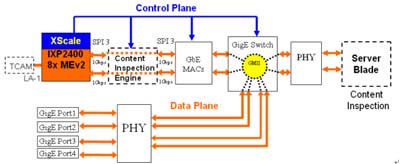 Inspection),表頭辨識系針對其流向、連結(jié)、輸入端口及目的地址等做比對;內(nèi)容檢查則有復雜的算法,處理頻寬及內(nèi)存容量需求極高,很顯然內(nèi)容檢查即將是此系統(tǒng)非常嚴重的交通瓶頸所在,這個運算將耗用大量IXP-2400網(wǎng)絡處理器的運算資源。因此必須采用另一個處理器卸載此運算,有兩種方法可行,其一是如圖四:加入一顆個可程序內(nèi)容檢查引擎(Programmable