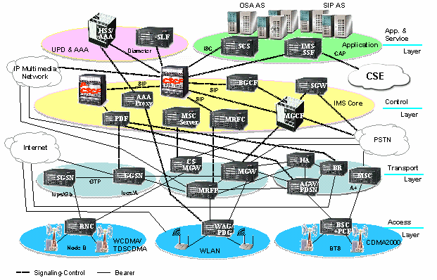 控制層是由以IMS為核心的所有控制部分所組成。IMS獨立于接入技術,是3G"家族"公用的。IMS基于IP技術,支持語音、視頻、文字、數(shù)據(jù)等業(yè)務以及這些業(yè)務的組合,支持IPv6和QoS,支持開放的業(yè)務接口。該層還包括如MSC服務器,信令網(wǎng)關等設備。