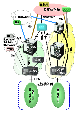 PDS采用MIP技術,是支持多媒體的和傳統(tǒng)的移動數(shù)據(jù)業(yè)務的網(wǎng)絡。AGW包括PDSN以及其他一些所需要的功能,提供了對各種接入網(wǎng)絡的公共接口。它提供移動IP登記和鑒權,支持外部代理(FA)和分組數(shù)據(jù)傳輸,切換、AAA客戶端、QoS管理和策略執(zhí)行等功能。歸屬代理(HA)主要完成用戶當前附著點的登記和用戶IP包的前轉兩大功能。