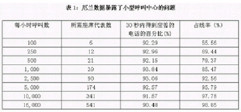 這張厄蘭表生動(dòng)地說明了當(dāng)呼叫中心規(guī)模增長是其效率的迅速增長。這張表對應(yīng)的情況是這樣的:處理每一個(gè)呼叫的平均時(shí)間是2分鐘。要實(shí)現(xiàn)的目標(biāo)是90%的呼叫要在30秒內(nèi)得到應(yīng)答。第一列顯示了呼叫量的增長,第二列顯示了相對于特定的呼叫量,為達(dá)到指定的服務(wù)水平,在該厄蘭模型下所需的最少座席代表數(shù)。