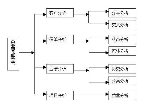 通過商業(yè)智能可以實(shí)現(xiàn)對客戶分析、保單分析、業(yè)績分析和項(xiàng)目分析等各項(xiàng)內(nèi)容進(jìn)行管理分析。它包含5個(gè)決策分析模型以及超過60種的商業(yè)智能分析報(bào)表,內(nèi)嵌式數(shù)據(jù)挖掘模型與決策分析報(bào)表為電話營銷管理人員提供了有力的分析工具,對于銷售管理起到了定量分析、定性決策的重要支撐作用,支持不同層次的管理者進(jìn)行不同范圍的決策。其系統(tǒng)架構(gòu)圖如下: