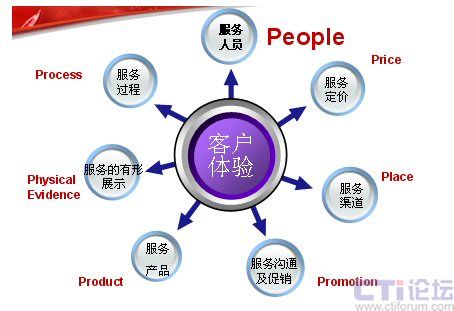 下面這張圖是服務營銷的7P模型,在這里我認為最應該關注的是People——人。這里,我想引用世界經理人刊登的一篇文章“影響中國的十大管理理念”上的一段文字:“邁向服務型經濟實際上就是邁向人才經濟。在制造業(yè)中,價值是由機器創(chuàng)造的。在服務業(yè)中,價值則是人創(chuàng)造的!边@也是在服務業(yè)中,要將“人”進行體現。也許你不在乎為你制造產品的工人長的美或丑,但為客戶服務的人員如果長的很丑,對服務就會有一定的影響。大家只看產品結果,不關注過程,但是服務卻是與過程緊密的結合。