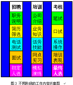 即使經(jīng)過規(guī)范的上崗培訓(xùn)與考核,新員工通常也只達(dá)到老員工70%左右的表現(xiàn)。因此制定明確的實(shí)習(xí)期,在實(shí)習(xí)期間加強(qiáng)指導(dǎo)和培養(yǎng)是非常重要的。通常經(jīng)過3個(gè)月的實(shí)習(xí),新員工已經(jīng)可以達(dá)到一個(gè)標(biāo)準(zhǔn),這時(shí)便可以轉(zhuǎn)正了。圖3和圖4表現(xiàn)了不同階段對(duì)CSR的不同預(yù)期,以及不同階段的主要工作。