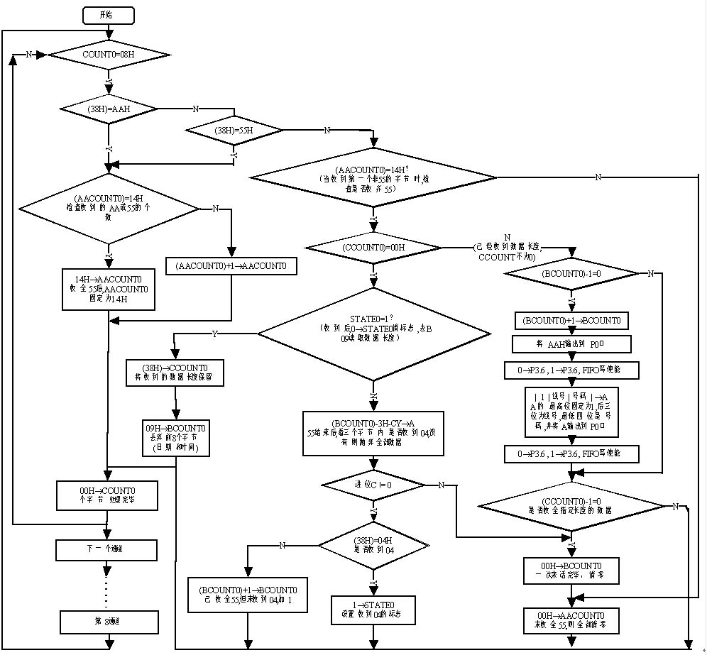(3)在連續(xù)收到至少20個(gè)55h數(shù)據(jù)(即通道占用信號(hào))后,程序才往下執(zhí)行,否則表明此次FSK數(shù)據(jù)出錯(cuò),應(yīng)退出本次收號(hào)。