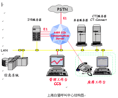 隨著企業(yè)間相互競爭的加劇,用戶對企業(yè)服務(wù)要求的提高,越來越多的企業(yè)承諾為用戶提供一個24小時的客戶服務(wù)環(huán)境,用戶可以隨時獲得聲音、文字、文件等服務(wù)。而呼叫中心可為企業(yè)解決這些問題。阿爾卡特作為著名的企業(yè)通信產(chǎn)品供應(yīng)商,可以為企業(yè)提供一套完整的多媒體呼叫中心平臺解決方案。上海白貓有限公司是國內(nèi)著名的洗滌系列產(chǎn)品供應(yīng)商,提供多種渠道為分銷商和用戶提供產(chǎn)品和服務(wù)。面對競爭對手,面對客戶的要求,上海白貓決定建設(shè)電子商務(wù)平臺,通過電話、傳真、郵件、網(wǎng)站各種接入手段,結(jié)合公司的物流系統(tǒng),倉庫管理,網(wǎng)站系統(tǒng),建立客戶關(guān)系管理,經(jīng)營策略分析。從而鞏固其在同行業(yè)的地位,獲得更大的競爭力。阿爾卡特為上海白貓有限公司提供OmniPCX 4400交換機(jī)解決方案。采用CCD排隊軟件,采用CCS呼叫管理軟件。CTI中間件采用CT-Connect。