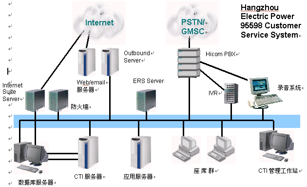 西門子Hicom 350E,作為杭州電力"95598"客服系統(tǒng)的通信服務(wù)器,以其出色的品質(zhì)和強大的功能保證了整個系統(tǒng)的正常運行。同時充分利用杭州電力局原有的通訊線路,創(chuàng)新性的在原有的SDH(同步數(shù)字體系)網(wǎng)絡(luò)上利用HiPath HG 3200遠(yuǎn)端模塊,將中心的人工坐席延伸到了五個郊縣電力公司,真正解決了全市統(tǒng)一接入,一個號碼對外,業(yè)務(wù)本地受理的問題;同時遠(yuǎn)端坐席的工作方式真正做到和中心完全一致,給使用、管理、培訓(xùn)等帶來極大的便利。