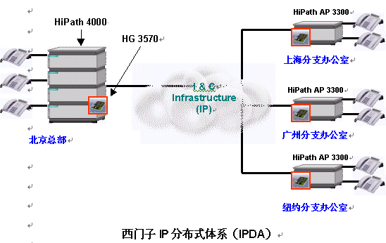 IP分布式體系(IPDA)建于西門子HiPath通信平臺之上,它能解決您的上述煩惱。在各分支辦公室部署HiPath接入點(diǎn)(Access Point)后,同時在集成IP網(wǎng)關(guān)HiPath HG 3500家族的幫助下,HiPath能夠建立起一個將所有分支辦公室包括在內(nèi)的IP通信網(wǎng)絡(luò)。
