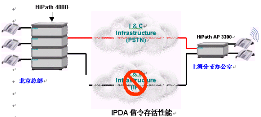 人們也許會問,IP語音(VoIP)是否足夠可靠?如果IP網(wǎng)絡(luò)上的信令通道出現(xiàn)故障,HiPath平臺仍將保證對各接入點(diǎn)的控制,從而提供了可靠的信令存活性能(Signaling Survivability)。在下面的圖例中,當(dāng)企業(yè)IP網(wǎng)絡(luò)出現(xiàn)某些問題后,信令通道轉(zhuǎn)移到了公共交換電話網(wǎng)絡(luò)(PSTN)之上。