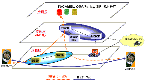 VPN等。圖中以移動分組網(wǎng)的承載方式為例,描述了IMS用戶通過手機(jī)進(jìn)行IMS會話的方式,主要的承載層設(shè)備有SGSN、GGSN,以及媒體網(wǎng)關(guān)MGW。SGSN和GGSN可以完全重用現(xiàn)網(wǎng)設(shè)備,不需要硬件升級,僅通過做相關(guān)配置就可以支持IMS了。MGW是負(fù)責(zé)媒體流在IMS域和CS域互通的功能實體,主要解決話音互通問題。無論具體采用哪一種接入方式,只要基于IP技術(shù),所有的IMS用戶信令就可以很好地傳送到控制層。