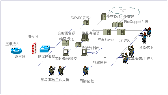 經(jīng)過對比分析,我們發(fā)現(xiàn),目前國際國內(nèi)市場上很多客戶服務產(chǎn)品,大都僅僅完成客戶服務的一部分。北極星“IP互動客戶服務中心解決方案”則引入互動客戶服務(ICS:Interactive Customer Service)系統(tǒng)以及數(shù)碼互動直播的概念,形成了由視頻點播、網(wǎng)上路演、語音和文字交互、IP客戶服務中心、Web800語音電話、實時服務中心、專家實時在線、客戶關系管理、在線尋呼系統(tǒng)和客戶社區(qū)服務系統(tǒng)等全方位的服務內(nèi)容。該方案主要基于IP架構(gòu),系統(tǒng)擴展性非常靈活,系統(tǒng)體現(xiàn)的客戶服務思想非常能夠滿足我們的需求。2001年3月,經(jīng)過一段時間的試運行后,我們正式推出了這套“IP互動客戶服務”系統(tǒng)。