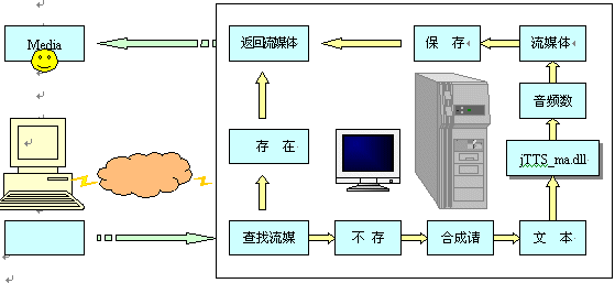 瀏覽器端(Explorer)發(fā)出瀏覽請(qǐng)求,網(wǎng)站服務(wù)器(IIS)根據(jù)請(qǐng)求查找流媒體(音頻流)文件,如有,則將流媒體返回客戶端,并啟動(dòng)客戶端的MS media player播放流媒體。若沒(méi)有,則向語(yǔ)音服務(wù)器(jTTS Service)發(fā)出合成請(qǐng)求,并將所需合成的文本通過(guò)Socket接口傳送至語(yǔ)音服務(wù)器;語(yǔ)音服務(wù)器響應(yīng)網(wǎng)站服務(wù)器的合成請(qǐng)求后,將調(diào)用jTTS合成技術(shù)進(jìn)行語(yǔ)音合成,并調(diào)用WMF SDK將生成的音頻文件轉(zhuǎn)換成流媒體格式ASF;通過(guò)Socket接口返回IIS服務(wù)器端后,將此流媒體文件存儲(chǔ)到指定的Web目錄,同時(shí)將流媒體返回瀏覽器端,啟動(dòng)MS media player播放。其流程如下:
