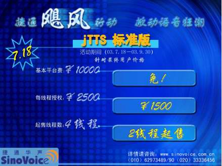 2003年7月18日,北京捷通華聲語音技術(shù)有限公司正式發(fā)布捷通華聲語音合成技術(shù) “jTTS標準版”。為慶!癹TTS標準版”的正式上市,為期近三個月,推廣“jTTS標準版”的捷通“颶風(fēng)行動”也在同一時間正式啟動! 捷通“颶風(fēng)行動”的宗旨--用全新的產(chǎn)品、全方位的服務(wù)、最具競爭力的價格與所有CTI領(lǐng)域的企業(yè)合作,開啟面向中小型CTI系統(tǒng)語音應(yīng)用的市場大門,為CTI產(chǎn)業(yè)發(fā)展提供持久動力支持!