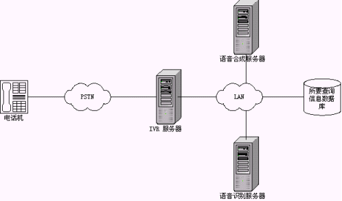 這種模式是最常見的一種接入情況。將原有煩瑣的按鍵式提示改成更具人性化的交談式語音交互,類似于語音門戶模式。這是目前大家普遍認同的一種語音識別技術(shù)應(yīng)用方式。相比原有的按鍵方式,系統(tǒng)的新穎程度、個性化程度、用戶操作的方便程度等都得到了極大的提高,如語音識別技術(shù)在股票查詢中的成功應(yīng)用,在點歌系統(tǒng)中的成功應(yīng)用等;另外利用語音識別技術(shù)也解決了一些原有系統(tǒng)無法實現(xiàn)的技術(shù)難題,如火車時刻查詢、機場航班查詢等,原有系統(tǒng)借助郵政編碼、電話區(qū)號等的方式讓人無所適從,現(xiàn)在直接和系統(tǒng)交談,順利獲取所需信息,可以說是語音識別技術(shù)一個成功的應(yīng)用。這種系統(tǒng)的拓撲結(jié)構(gòu)如下圖示: