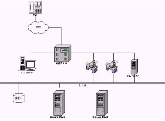 IVR模式是最常見的一種模式,這種模式也可以結(jié)合應(yīng)用到前端以交換機接入的系統(tǒng)中去,在系統(tǒng)的IVR服務(wù)流程上,做出相應(yīng)的修改,加入語音識別技術(shù),同樣可以得到成功應(yīng)用。另外一種模式暫且稱它為后備模式,該模式一個主要的特點是放在后端,比如在有座席接聽的情況下,采用語音識別技術(shù)的系統(tǒng)不被激活,也就是系統(tǒng)不給派線。當系統(tǒng)繁忙,而座席都占用的情況下,系統(tǒng)派線到采用語音識別技術(shù)的系統(tǒng),如同一個備用的座席。在這樣一個"座席"的軟件設(shè)計上,如同與人的交談一樣,系統(tǒng)也提出正常的詢問,但必須強調(diào)引導用戶來按照事先設(shè)定好的流程進行。這樣可以保證系統(tǒng)的接通率,特別是在一些對接通率和服務(wù)及時性要求比較高的場合采用,典型的代表如電信114查號臺和移動的1860客服中心,這些系統(tǒng)往往是隨著用戶急劇增加,撥打量也在穩(wěn)步上升,而呼叫響應(yīng)要求及時。系統(tǒng)拓撲結(jié)構(gòu)如下圖示。