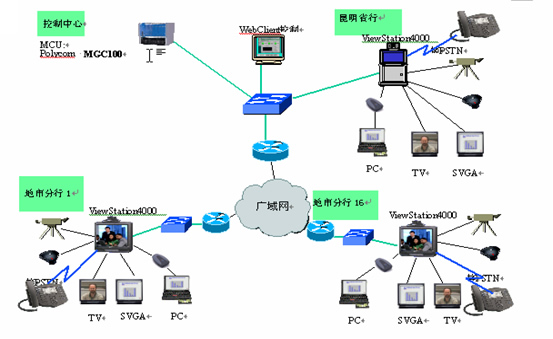 云南省中國銀行主會場放置1臺MGC-100 MCU和1臺視訊會議終端ViewStation4000,1套雙流模塊;其他16個地市各放置1臺視訊會議終端ViewStation4000,1套雙流模塊。MCU和視訊終端通過以太網交換機接入傳輸網絡,根據各分地市網絡實際帶寬,視頻會議的帶寬定為2M。