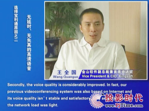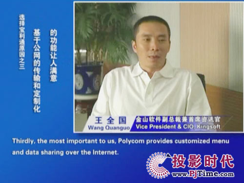 金山軟件副總裁兼首席資訊官王全國先生說道:“對(duì)于軟件行業(yè)來說,及時(shí)、高效的溝通是保持競爭優(yōu)勢(shì)的重要前提。相比之前使用的標(biāo)清產(chǎn)品,寶利通高清視頻會(huì)議系統(tǒng),提供了完全不同的體驗(yàn),流暢的高清晰畫面猶如真實(shí)的面對(duì)面溝通。而且我們公司并沒有申請(qǐng)專線,所有的應(yīng)用都是基于公網(wǎng)實(shí)現(xiàn)的。另一方面,新型全中文定制菜單的運(yùn)用,令我們使用起來非常方便,這更提高了我們使用視頻通信手段實(shí)現(xiàn)異地溝通的熱情!