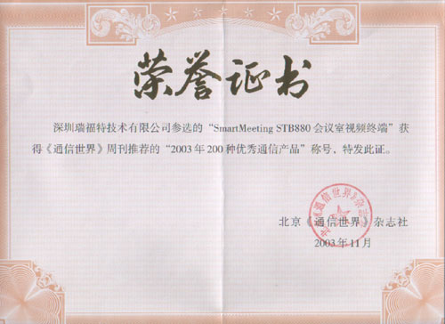 瑞福特視頻會(huì)議產(chǎn)品榮獲"2003年200種優(yōu)秀通信產(chǎn)品"稱號