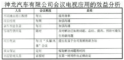 下表通過對神龍汽車有限公司應用會議電視系統(tǒng)的分析,展示了會議電視虛擬應用所帶來的益處。