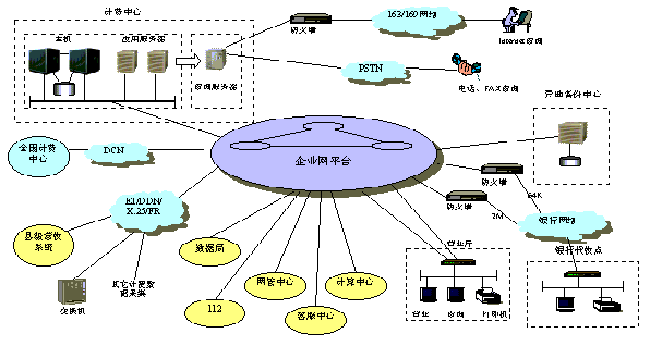 縣計(jì)費(fèi)中心采用64K DDN連接各營(yíng)業(yè)廳和支局,縣銀行通過銀行網(wǎng)絡(luò)連入企業(yè)網(wǎng)平臺(tái),鄉(xiāng)鎮(zhèn)代收點(diǎn)視具體條件的不同可采用DDN、ISDN或PSTN方式連入計(jì)費(fèi)中心。