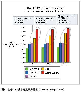 All-IP上的領(lǐng)先地位的進(jìn)一步鞏固,中興通訊已經(jīng)成為全球CDMA的領(lǐng)導(dǎo)者, Yankee group 2008年的一份咨詢報告顯示,中興通訊CDMA綜合排名穩(wěn)居全球第一集團(tuán)行列(見圖1)。