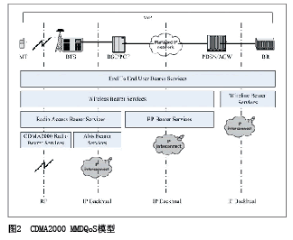 如圖2, CDMA2000 MMD QoS模型是由終端、接入網(wǎng)絡(luò)和核心網(wǎng)絡(luò)共同保證。終端和無線接入網(wǎng)之間的空中接口定義相關(guān)的QoS服務(wù)參數(shù)和級別;在無線接入網(wǎng)BSC和PCF之間的A8接口以及PCF和PDSN/AGW之間的A10接口上分配滿足用戶已被授權(quán)的QoS要求的資源;核心網(wǎng)提供在PDSN/AGW和邊界路由器(BR)之間的QoS服務(wù)。
