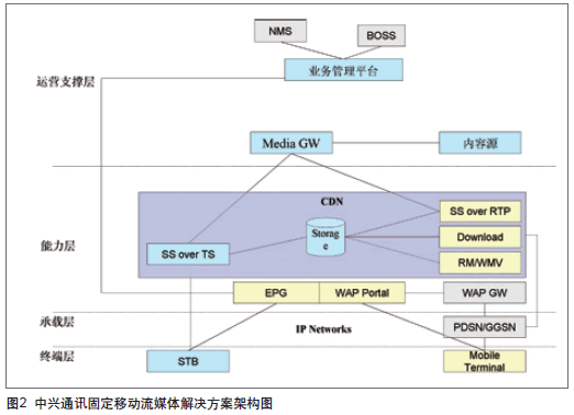 中興通訊的固定移動(dòng)流媒體解決方案,是在充分比較兩網(wǎng)的異同點(diǎn)之后,構(gòu)架的全新方案,其組網(wǎng)架構(gòu)如圖2所示。