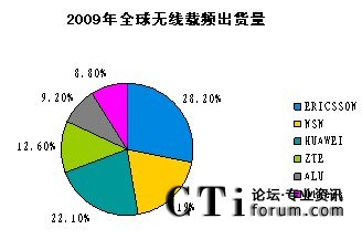 CTI論壇(ctiforum)4月16日消息(記者 潘婷婷): 近日,業(yè)內(nèi)著名調(diào)研公司Infonetics發(fā)布了2009年全球無線通信設(shè)備市場研究報告《2G/3G Mobile Infrastructure and Subscribers》。根據(jù)報告顯示,2009年全年,全球無線通信市場份額出現(xiàn)了較大變化,按載頻計,中興通訊全年以12.6%的全球市場份額超越阿爾卡特-朗訊,居行業(yè)第4,按載頻計,2009年全球無線設(shè)備出貨市場份額排名為愛立信、華為、諾基亞-西門子、中興、阿爾卡特-朗訊,分別為28.2%,22.1%,19%,12.6%和9.2%。
