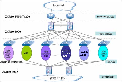 其中Internet接入層為保證線速轉(zhuǎn)發(fā),大容量(路由表、MAC等)和高可靠性,建議采用ZTE的高端核心路由器ZXR10 T600兩臺。核心交換層網(wǎng)絡(luò)的基本要求是:高可擴(kuò)展性、以太網(wǎng)端口密度高,大容量(路由表、MAC等)、高可靠性(全冗余結(jié)構(gòu))、和支持二層/三層VLAN和STP、PVST、802.3ad 、VRRP等等關(guān)鍵技術(shù)。ZTE提供的ZXR10 8900系列萬兆MPLS路由交換機(jī)完全滿足這些要求。它具有多個業(yè)務(wù)插槽,最大提供2880 Gbps的交換容量和2143Mpps的包轉(zhuǎn)發(fā)能力,支持多個萬兆接口或千兆接口,并且能夠提供豐富的業(yè)務(wù)功能。接入層建議采用中興ZXR10 5228/5252全千兆交換機(jī),用高速ASIC交換芯片實(shí)現(xiàn)L2和L3數(shù)據(jù)線速轉(zhuǎn)發(fā),提供完備的以太網(wǎng)協(xié)議族支撐和高效的QOS優(yōu)先級機(jī)制,具備靈活多樣的管理手段。ZXR10 5200提供高密度的GE光/電端口和10GE接口,能夠很好的完成數(shù)據(jù)中心中服務(wù)器接入的工作。